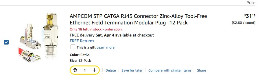 Package: Zinc-Alloy CAT6A Tool-Free Ethernet Field Termination Modular Plug -12 Pack