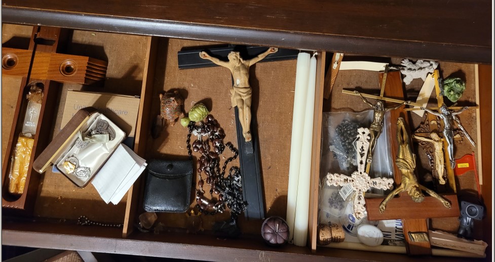Religious relics. Top buffet drawer in kitchen 906 Olde Towne. some belonged to Aunt Mary. Most are granny's.