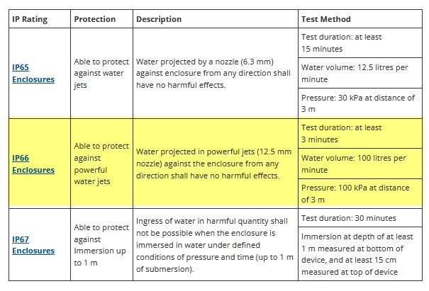 For enclosures, the typical waterproof IP ratings are IP67, IP66, and IP65 enclosures. The chart below gives the specifics of what these ratings mean and how they are measured.